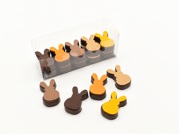 Verfijnde vulling van hazelnootpraliné in de vorm van schattige paashazen.